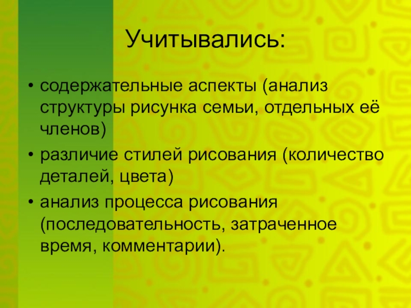 содержательные аспекты (анализ структуры рисунка семьи, отдельных её членов)