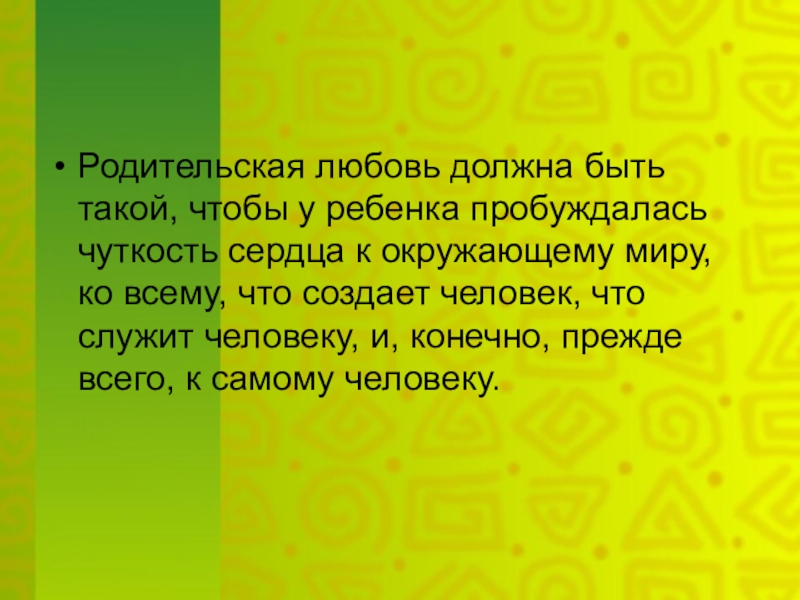 Слайд 18Родительская любовь должна быть такой, чтобы у ребенка пробуждалась чуткость сердца