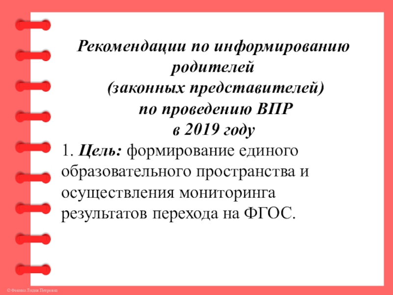 Цель: формирование единого образовательного пространства и осуществления мониторинга результатов перехода на ФГОС.
