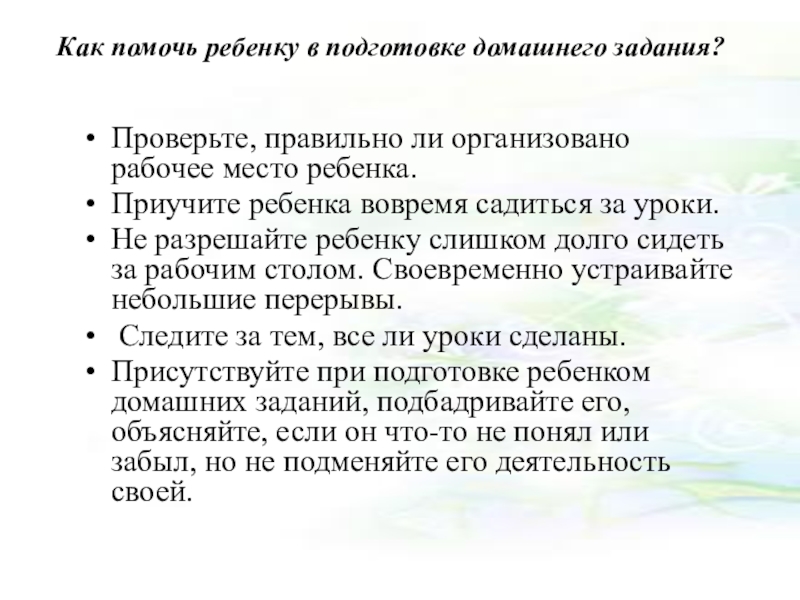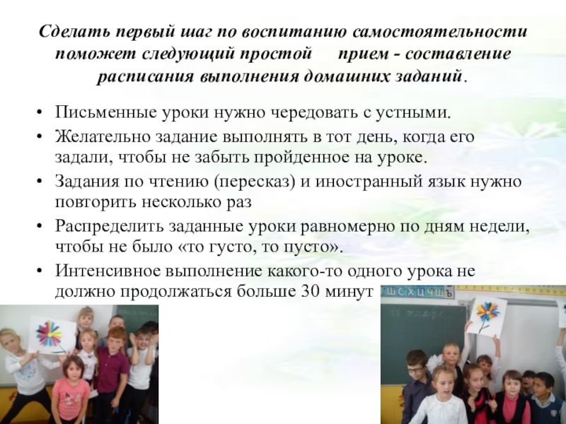 Желательно задание выполнять в тот день, когда его задали, чтобы не забыть пройденное на уроке.
