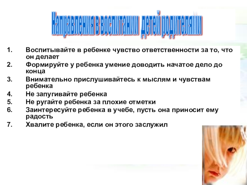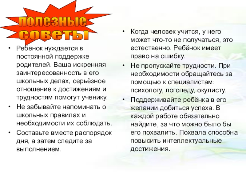 Поддерживайте ребёнка в его желании добиться успеха. В каждой работе обязательно найдите, за что можно было бы его похвалить. Похвала способна повысить интеллектуальные достижения.