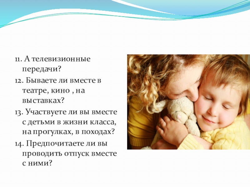 11. А телевизионные передачи?12. Бываете ли вместе в театре, кино , на выставках?13. Участвуете ли вы вместе