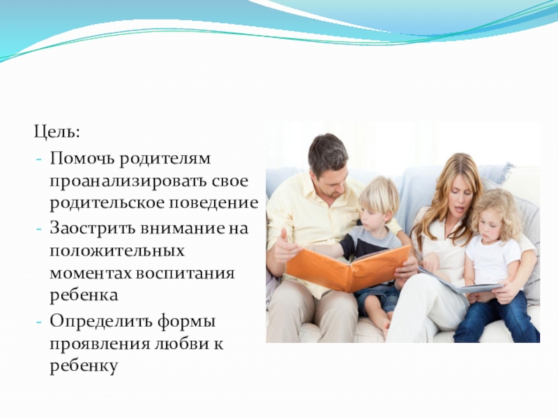 Цель:Помочь родителям проанализировать свое родительское поведениеЗаострить внимание на положительных моментах воспитания ребенкаОпределить формы проявления любви к ребенку