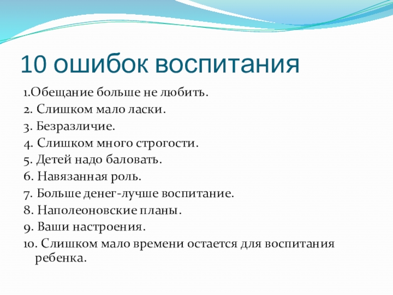 10 ошибок воспитания1.Обещание больше не любить.2. Слишком мало ласки.3. Безразличие.4. Слишком много строгости.5. Детей надо баловать.6. Навязанная