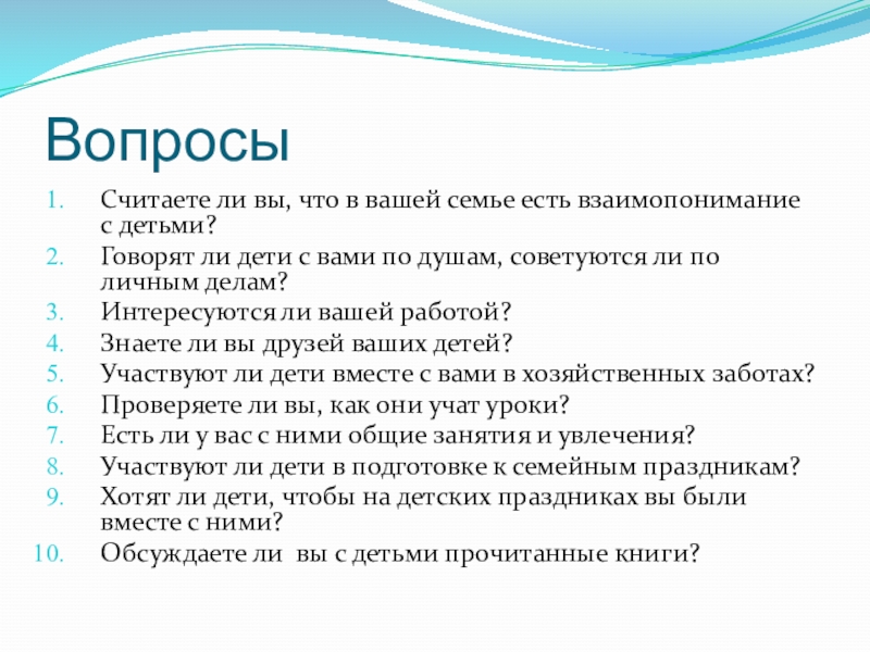 ВопросыСчитаете ли вы, что в вашей семье есть взаимопонимание с детьми?Говорят ли дети с вами по душам,