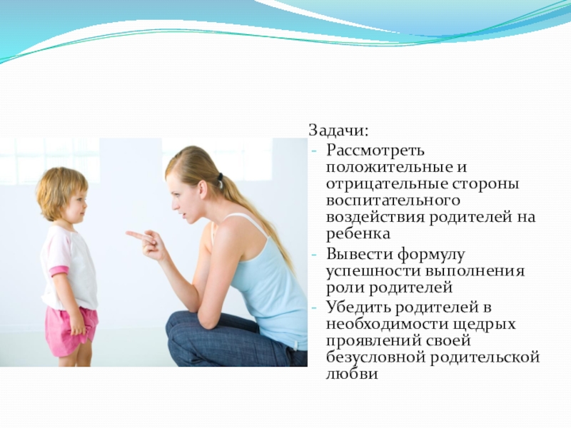 Задачи: Рассмотреть положительные и отрицательные стороны воспитательного воздействия родителей на ребенкаВывести формулу успешности выполнения роли родителейУбедить родителей