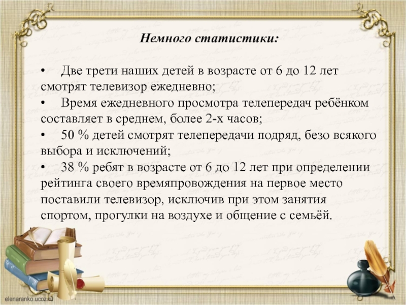 • Время ежедневного просмотра телепередач ребёнком составляет в среднем, более 2-х часов;