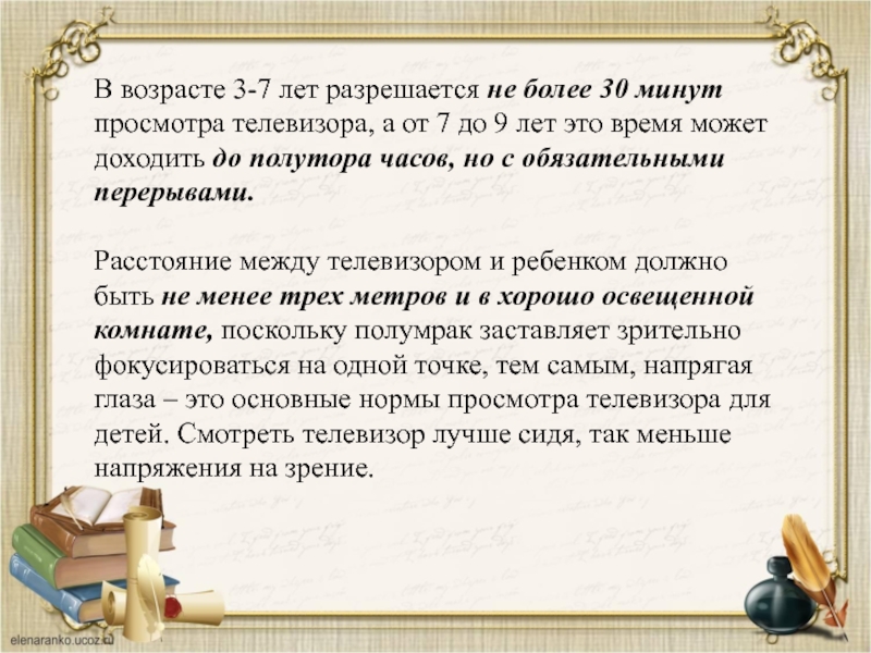 Слайд 6В возрасте 3-7 лет разрешается не более 30 минут просмотра телевизора,