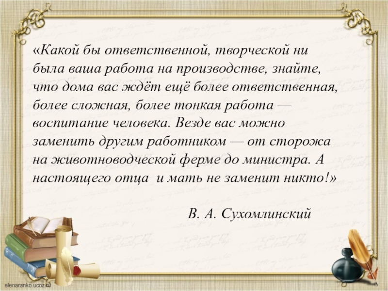 что дома вас ждёт ещё более ответственная, более сложная, более тонкая работа — воспитание человека. Везде вас можно заменить другим работником — от сторожа на животноводческой ферме до министра. А настоящего отца и мать не заменит никто!»