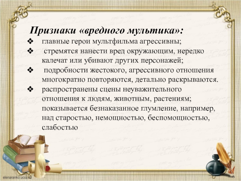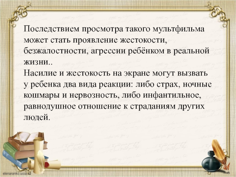 Слайд 9Последствием просмотра такого мультфильма может стать проявление жестокости, безжалостности, агрессии ребёнком