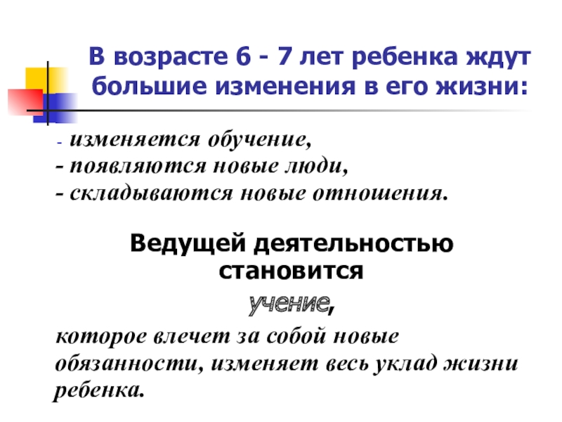Слайд 12В возрасте 6 - 7 лет ребенка ждут большие изменения в