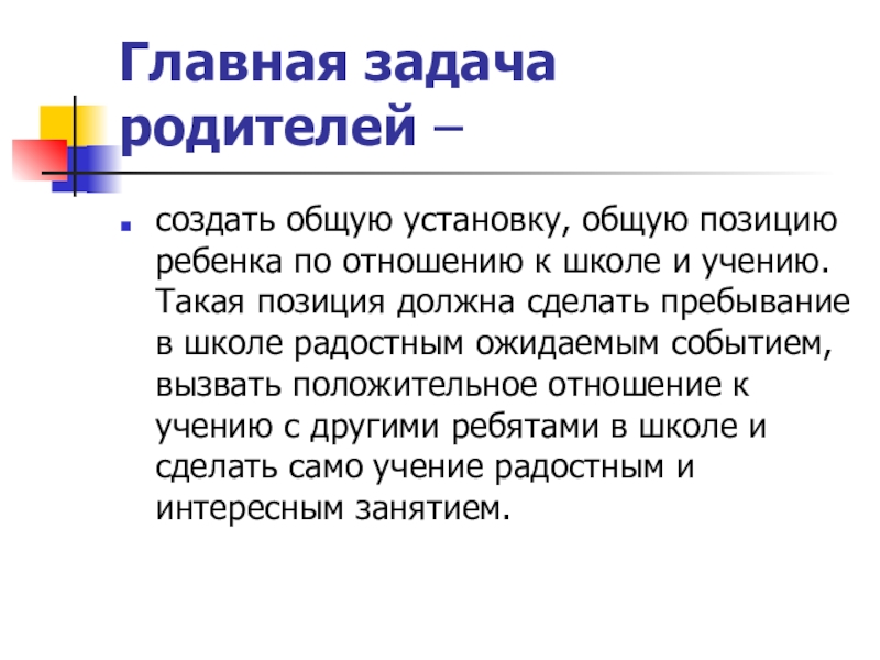 отношению к школе и учению. Такая позиция должна сделать пребывание в школе радостным ожидаемым событием, вызвать положительное отношение к учению с другими ребятами в школе и сделать само учение радостным и интересным занятием.
