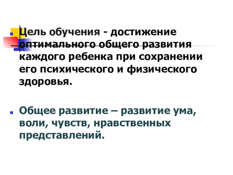 Слайд 11Цель обучения - достижение оптимального общего развития каждого ребенка при сохранении