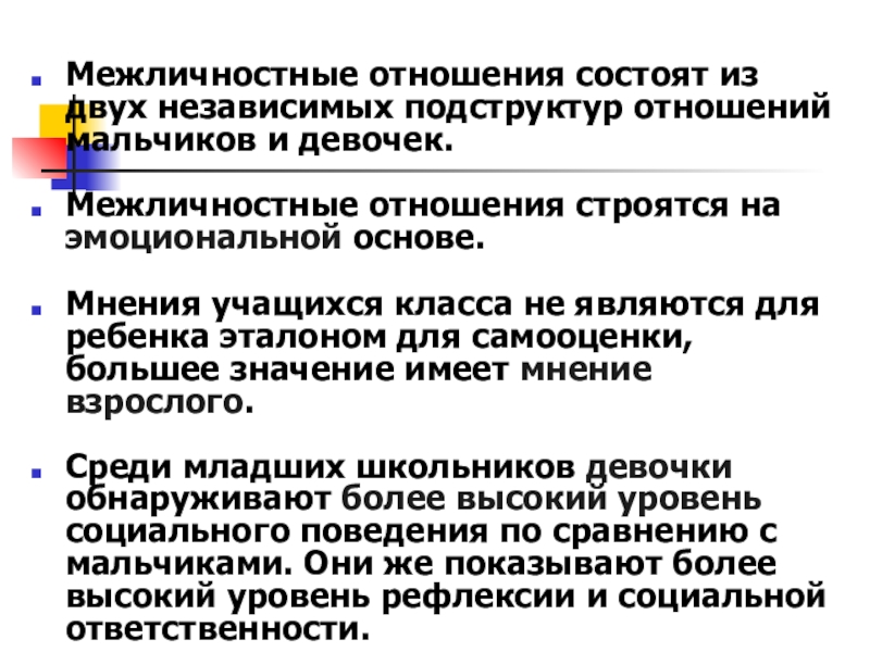 Слайд 19Межличностные отношения состоят из двух независимых подструктур отношений мальчиков и девочек.