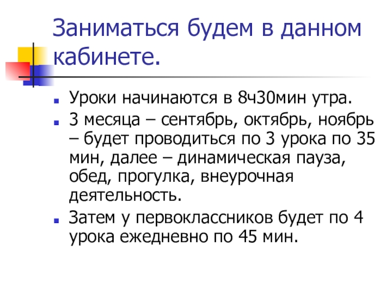сентябрь, октябрь, ноябрь – будет проводиться по 3 урока по 35 мин, далее – динамическая пауза, обед, прогулка, внеурочная деятельность.