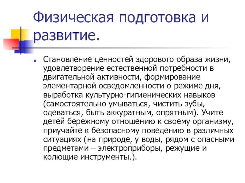 потребности в двигательной активности, формирование элементарной осведомленности о режиме дня, выработка культурно-гигиенических навыков (самостоятельно умываться, чистить зубы, одеваться, быть аккуратным, опрятным). Учите детей бережному отношению к своему организму, приучайте к безопасному поведению в различных ситуациях (на природе, у воды, рядом с опасными предметами – электроприборы, режущие и колющие инструменты.).