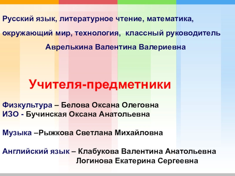 Русский язык, литературное чтение, математика, окружающий мир, технология, классный руководитель