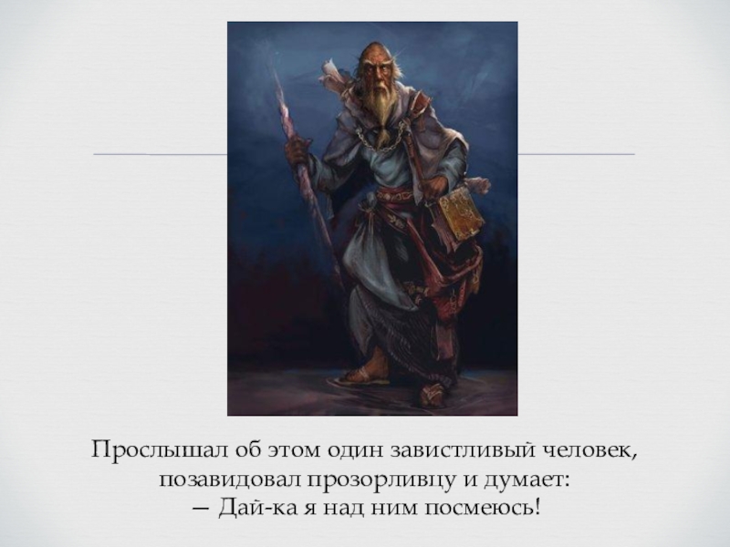 Слайд 6Прослышал об этом один завистливый человек, позавидовал прозорливцу и думает: — Дай-ка