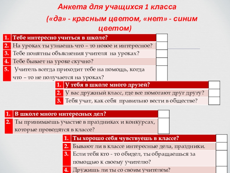 Анкета для учащихся 1 класса     («да» - красным цветом, «нет» - синим