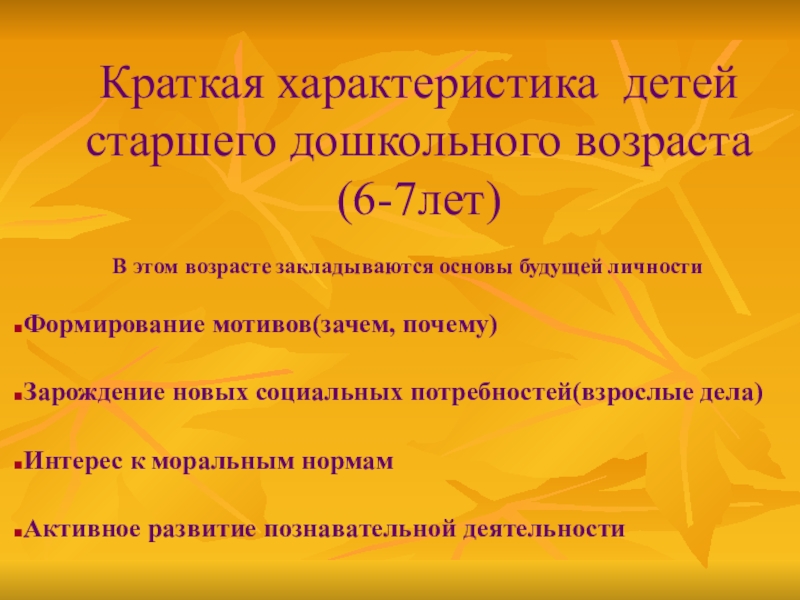 Краткая характеристика детей старшего дошкольного возраста (6-7лет)В этом возрасте закладываются основы будущей личностиФормирование мотивов(зачем, почему)Зарождение новых