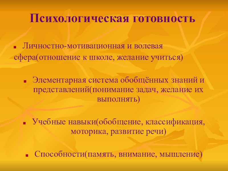 Психологическая готовностьЛичностно-мотивационная и волевая сфера(отношение к школе, желание учиться)Элементарная система обобщённых знаний и представлений(понимание задач, желание их