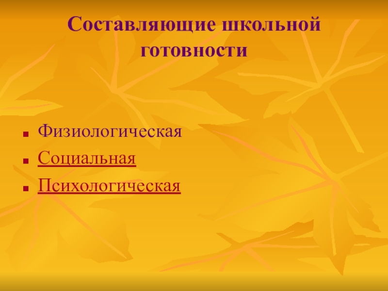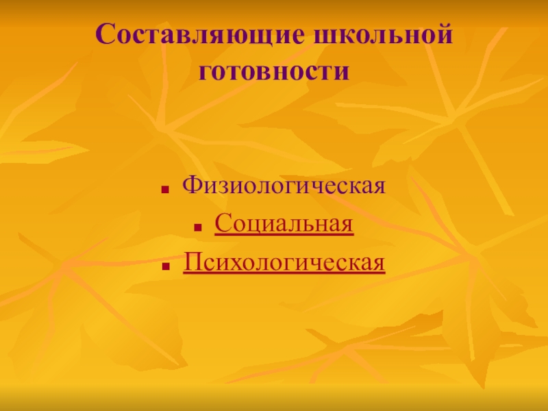 Составляющие школьной готовностиФизиологическаяСоциальнаяПсихологическая