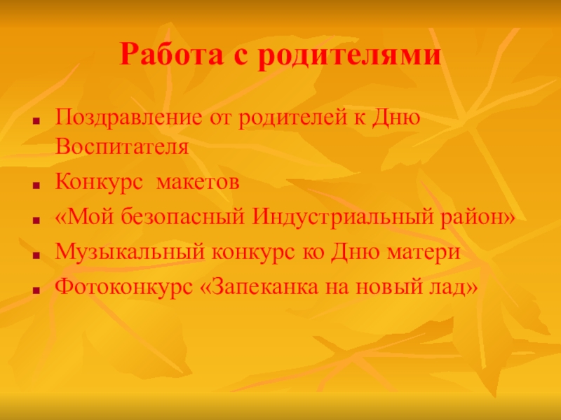 Работа с родителямиПоздравление от родителей к Дню ВоспитателяКонкурс макетов «Мой безопасный Индустриальный район»Музыкальный конкурс ко Дню материФотоконкурс