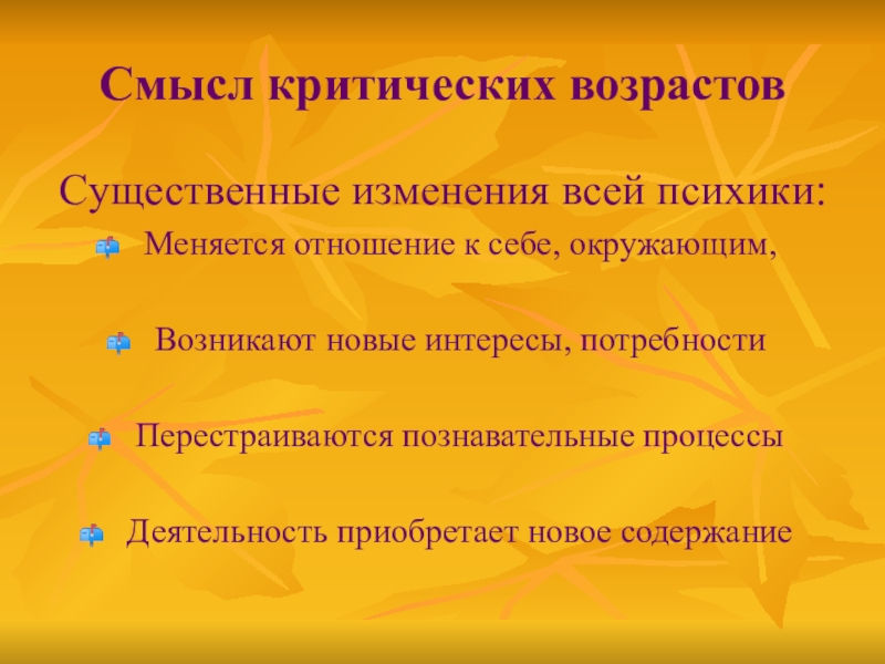 Смысл критических возрастовСущественные изменения всей психики:Меняется отношение к себе, окружающим,Возникают новые интересы, потребностиПерестраиваются познавательные процессыДеятельность приобретает новое