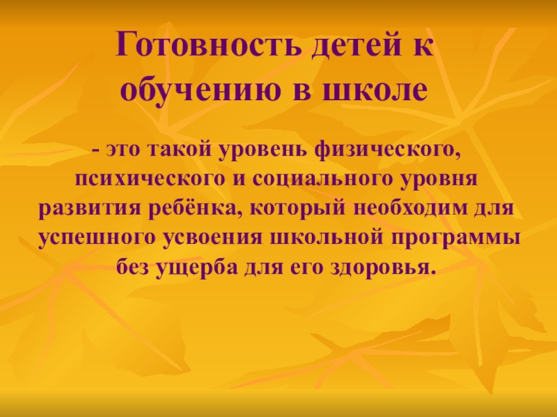 Готовность детей к обучению в школе- это такой уровень физического, психического и социального уровня развития ребёнка, который необходим для успешного усвоения школьной программы без ущерба для его здоровья.