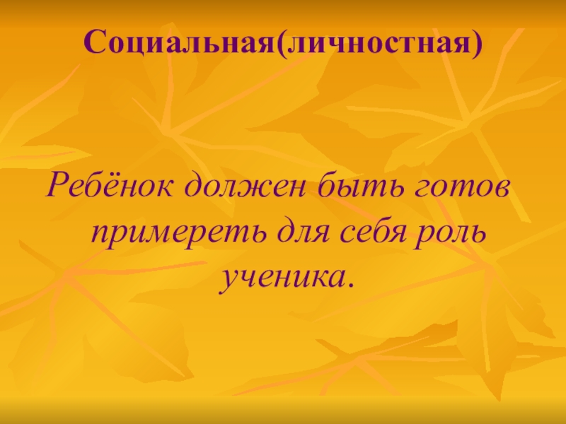 Социальная(личностная)Ребёнок должен быть готов примереть для себя роль ученика.