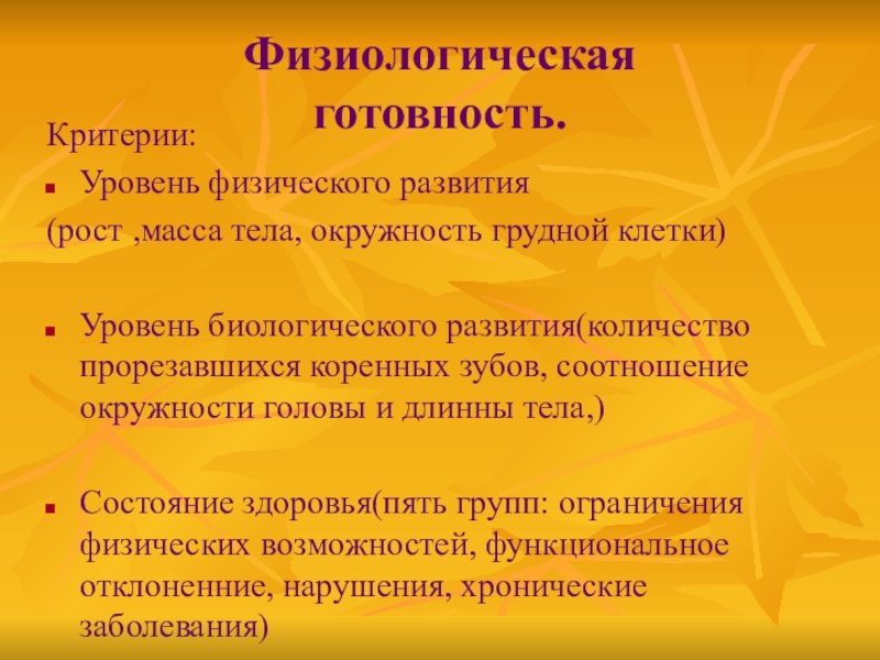 Физиологическая  готовность.Критерии: Уровень физического развития(рост ,масса тела, окружность грудной клетки)Уровень биологического развития(количество прорезавшихся коренных зубов, соотношение
