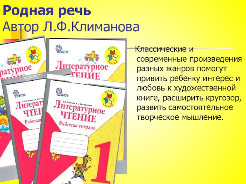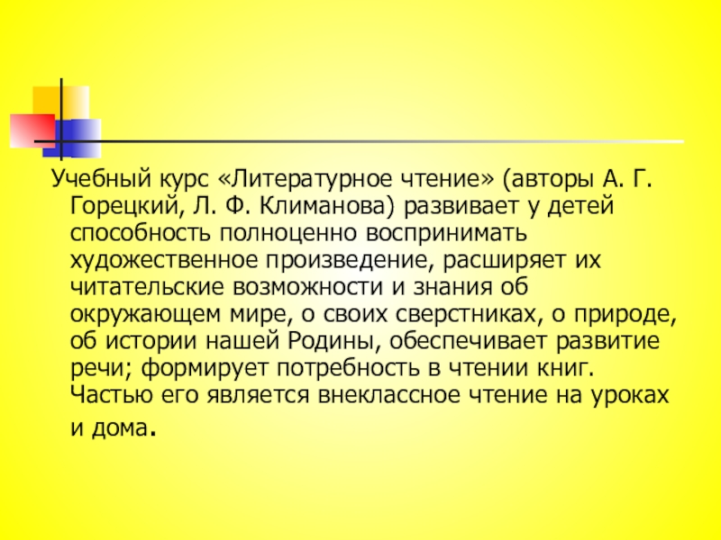 Г. Горецкий, Л. Ф. Климанова) развивает у детей способность полноценно воспринимать художественное произведение, расширяет их читательские возможности и знания об окружающем мире, о своих сверстниках, о природе, об истории нашей Родины, обеспечивает развитие речи; формирует потребность в чтении книг. Частью его является внеклассное чтение на уроках и дома.