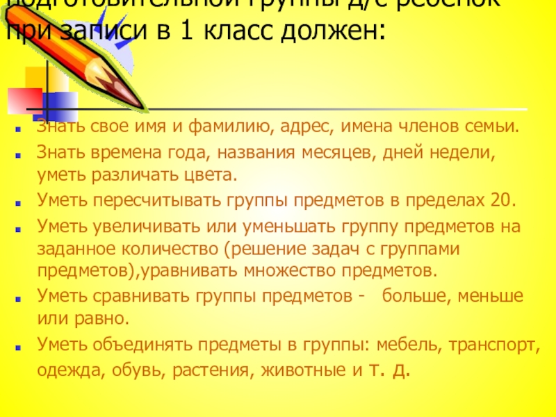 Слайд 13В соответствии с программой подготовительной группы д/с ребенок при записи в