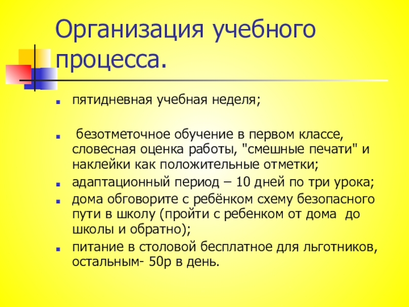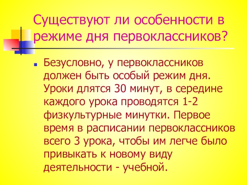 особый режим дня. Уроки длятся 30 минут, в середине каждого урока проводятся 1-2 физкультурные минутки. Первое время в расписании первоклассников всего 3 урока, чтобы им легче было привыкать к новому виду деятельности - учебной.