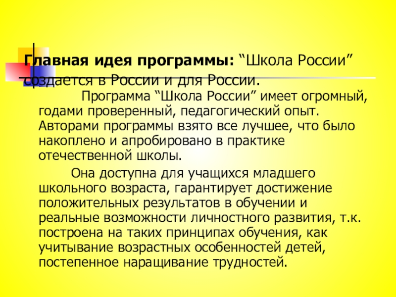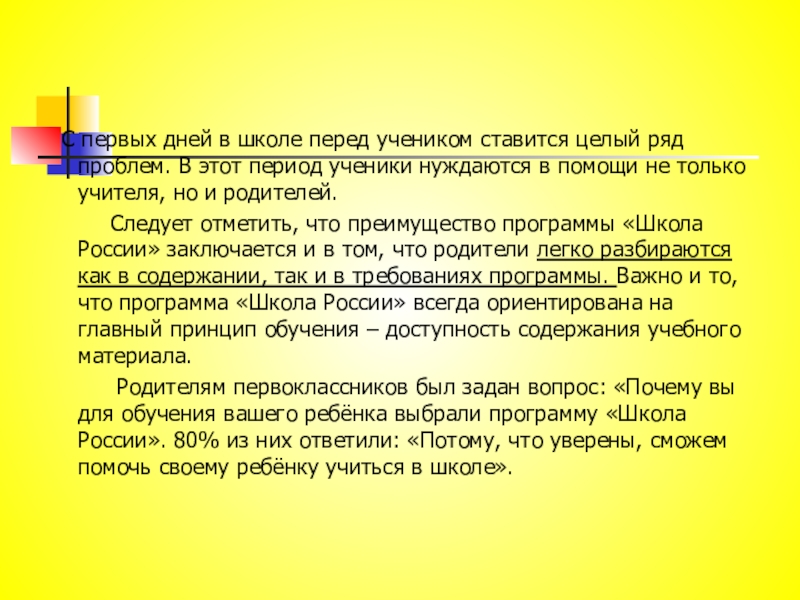 Следует отметить, что преимущество программы «Школа России» заключается и в том, что родители легко разбираются как в содержании, так и в требованиях программы. Важно и то, что программа «Школа России» всегда ориентирована на главный принцип обучения – доступность содержания учебного материала.