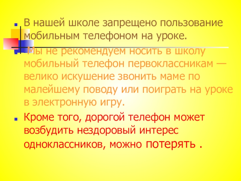 рекомендуем носить в школу мобильный телефон первоклассникам — велико искушение звонить маме по малейшему поводу или поиграть на уроке в электронную игру.