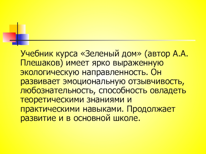имеет ярко выраженную экологическую направленность. Он развивает эмоциональную отзывчивость, любознательность, способность овладеть теоретическими знаниями и практическими навыками. Продолжает развитие и в основной школе.