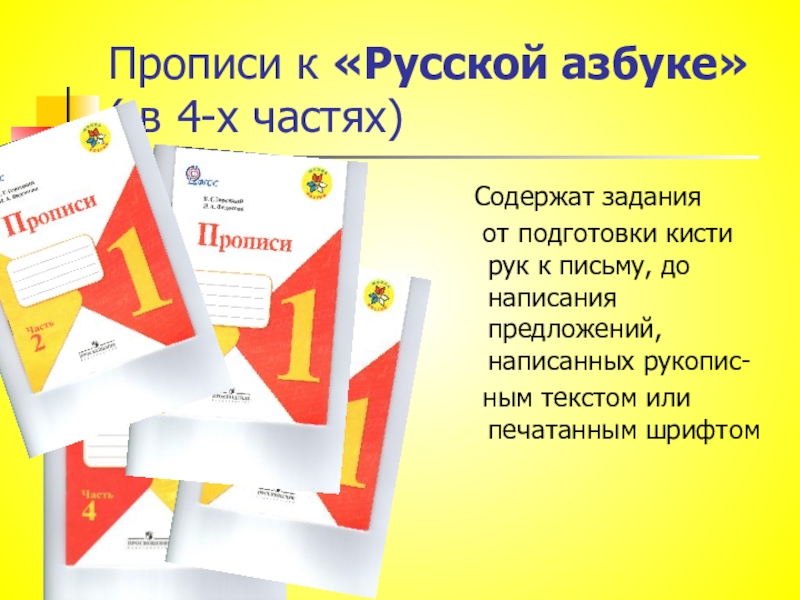 Параллельно с обучением чтению дети овладевают письмом. Для этого имеется комплект Прописей, в которых дети учатся обозначать на письме звуки буквами, правильно списывать буквы и слова с рукописного и печатного текста, писать по диктовку слова и предложения. Весь материал в Прописях расположен в соответствии с материалом Азбуки.