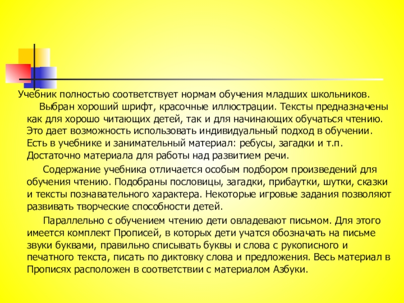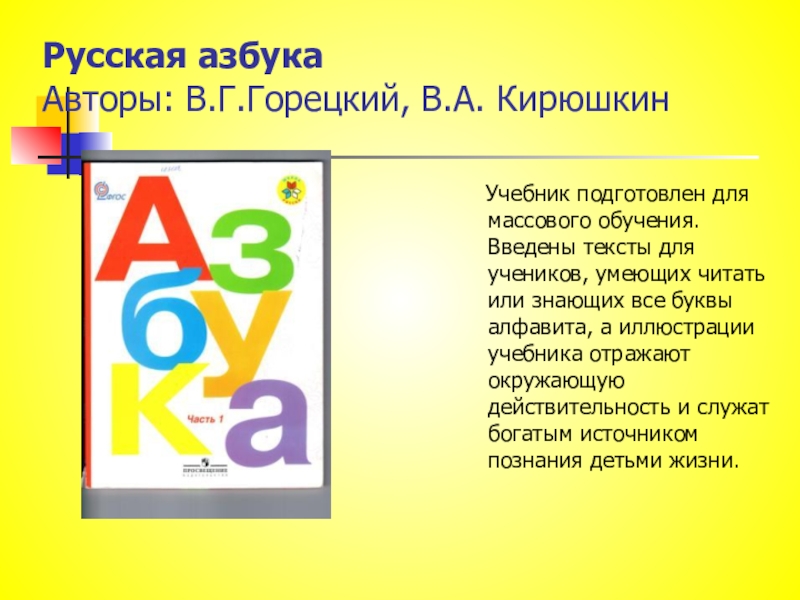 Введены тексты для учеников, умеющих читать или знающих все буквы алфавита, а иллюстрации учебника отражают окружающую действительность и служат богатым источником познания детьми жизни.