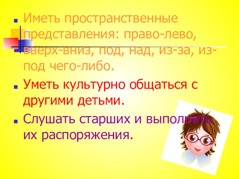 Знать времена года, названия месяцев, дней недели, уметь различать цвета.
