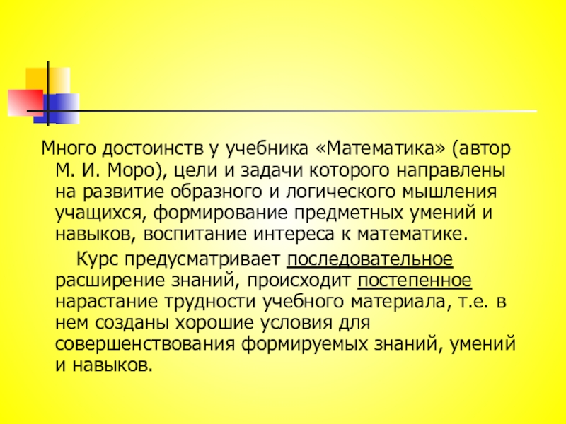 И. Моро), цели и задачи которого направлены на развитие образного и логического мышления учащихся, формирование предметных умений и навыков, воспитание интереса к математике.