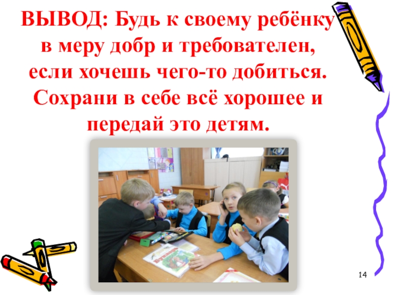 Слайд 14ВЫВОД: Будь к своему ребёнку в меру добр и требователен, если
