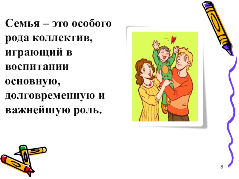 Слайд 8Семья – это особого рода коллектив, играющий в воспитании основную, долговременную