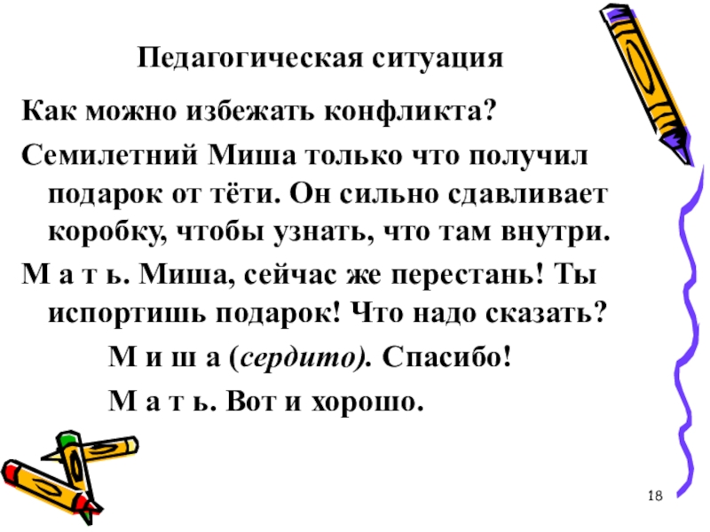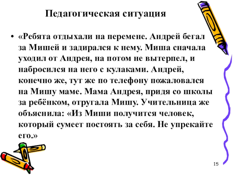 к нему. Миша сначала уходил от Андрея, на потом не вытерпел, и набросился на него с кулаками. Андрей, конечно же, тут же по телефону пожаловался на Мишу маме. Мама Андрея, придя со школы за ребёнком, отругала Мишу. Учительница же объяснила: «Из Миши получится человек, который сумеет постоять за себя. Не упрекайте его.»
