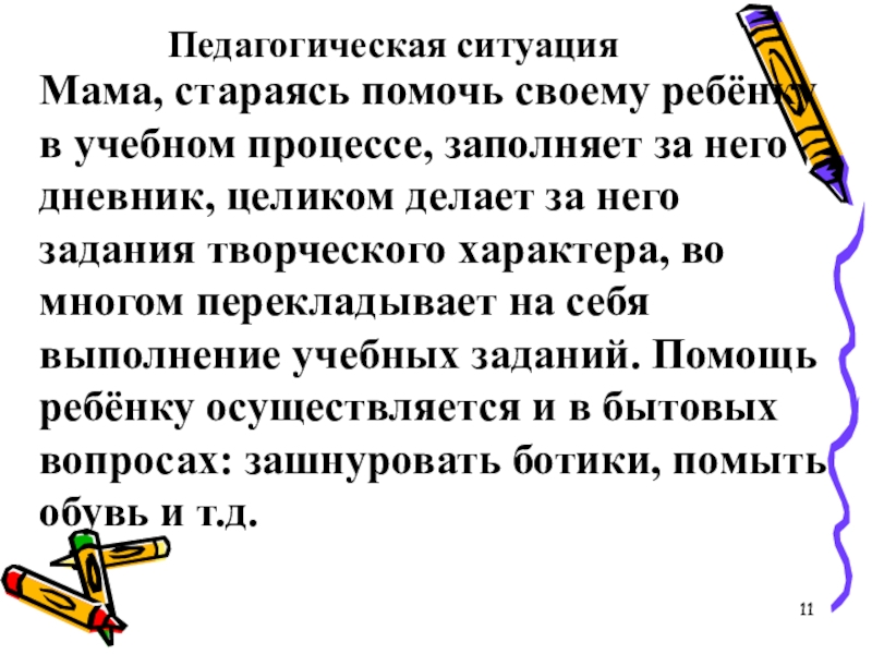него дневник, целиком делает за него задания творческого характера, во многом перекладывает на себя выполнение учебных заданий. Помощь ребёнку осуществляется и в бытовых вопросах: зашнуровать ботики, помыть обувь и т.д.