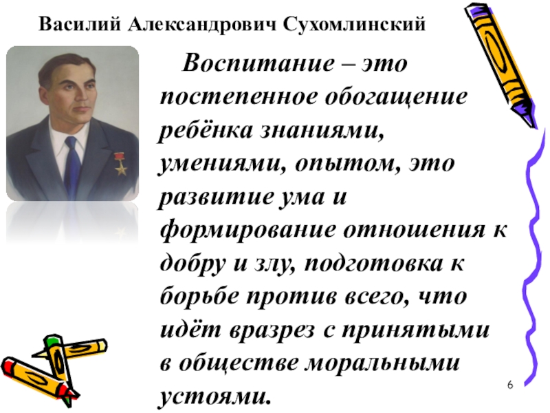 умениями, опытом, это развитие ума и формирование отношения к добру и злу, подготовка к борьбе против всего, что идёт вразрез с принятыми в обществе моральными устоями.