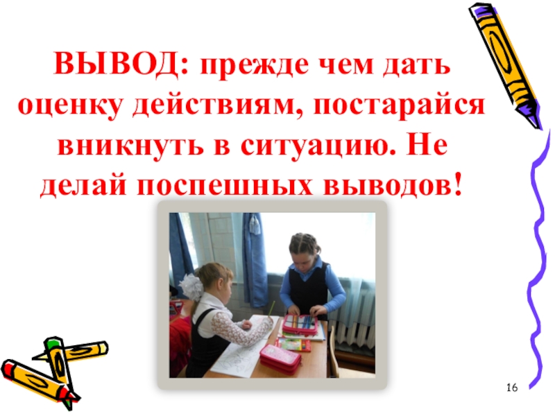 Слайд 16ВЫВОД: прежде чем дать оценку действиям, постарайся вникнуть в ситуацию. Не