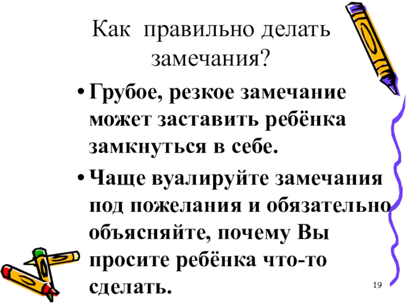 Чаще вуалируйте замечания под пожелания и обязательно объясняйте, почему Вы просите ребёнка что-то сделать.
