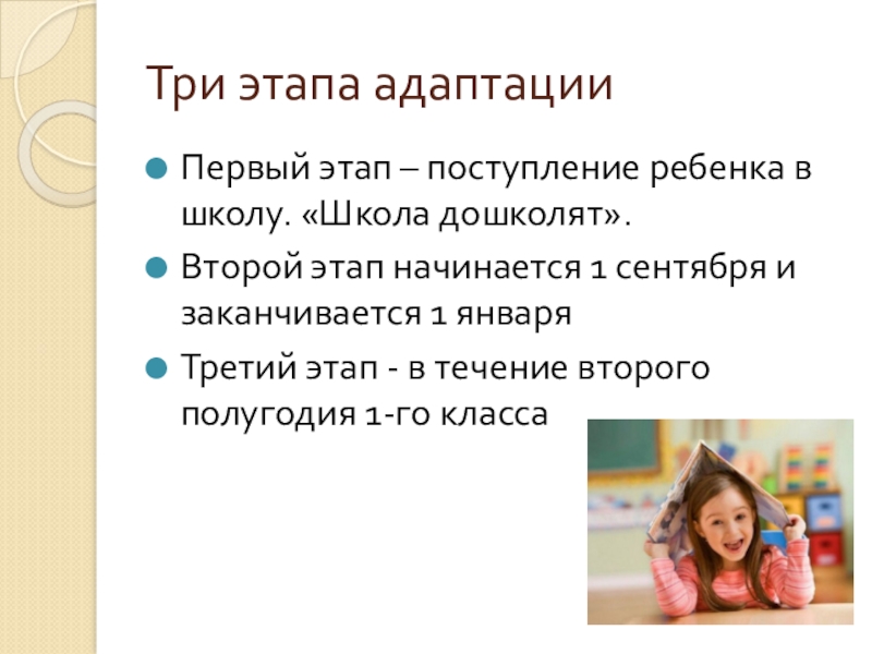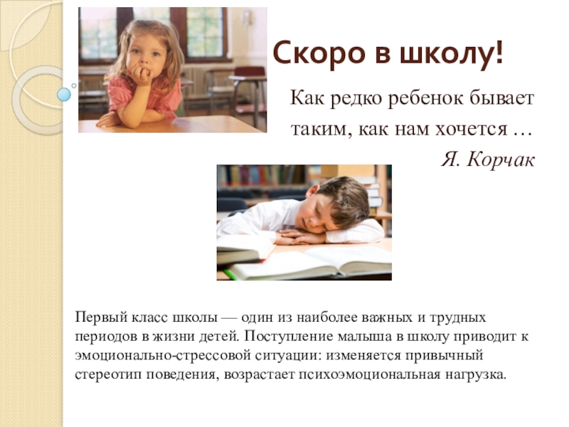 Первый класс школы — один из наиболее важных и трудных периодов в жизни детей. Поступление малыша в школу приводит к эмоционально-стрессовой ситуации: изменяется привычный стереотип поведения, возрастает психоэмоциональная нагрузка.