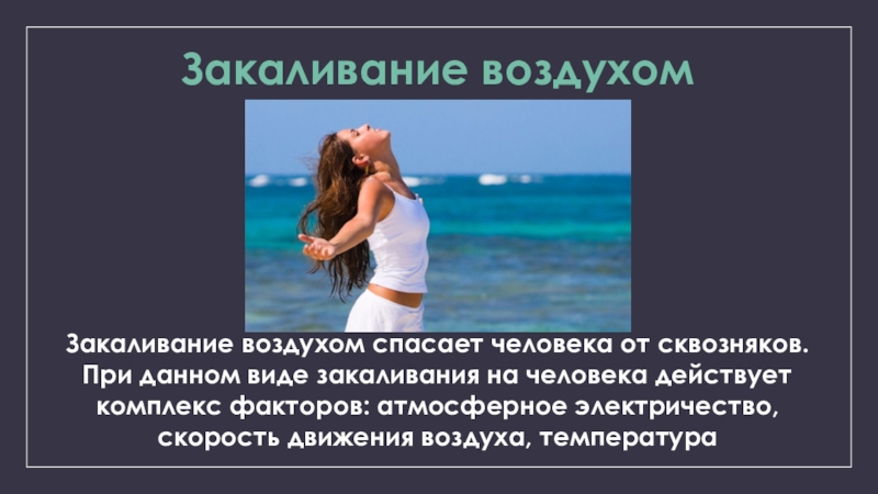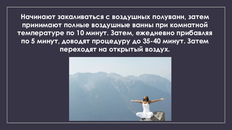 Слайд 10Начинают закаливаться с воздушных полуванн, затем принимают полные воздушные ванны при